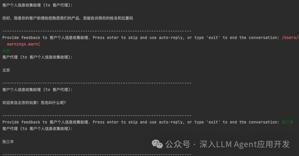 )以上我们定义了3个提供服务的Agent,我们还需要一个客户代理,帮助用户无缝接入对话,依照上节介绍,设定该Agent的human_input_mode为ALWAYS。