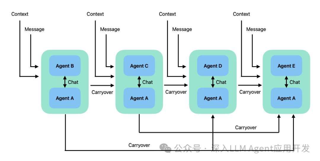 顾名思义,这是两两对话的升级版,一组两两对话通过一种名为结转(carryover)的机制串联起来的,将前两人的对话摘要传递给后面两人,具体细节如下图所示。这种模式的对话非常适用于将复杂人物拆解为互相依赖的子任务。