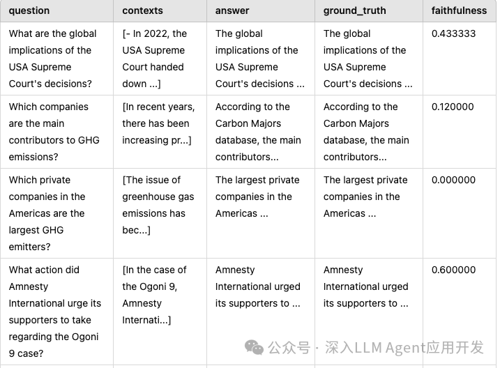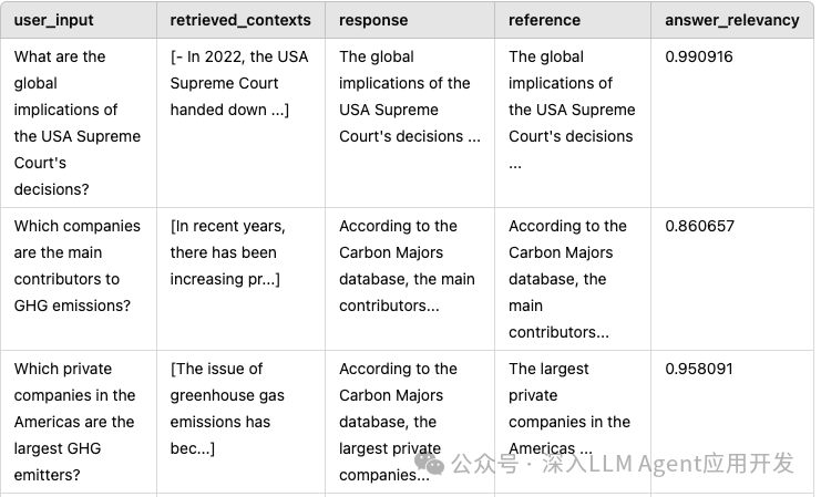 计算答案的相关性 Answer relevancy,它基于答案推测出多个问题,然后计算用户问题和推测出的问题的相关性,也就是嵌入的相似度,然后取平均值从而得出相关性。它也需要回答和问题。