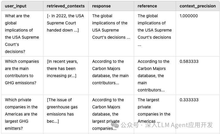 计算上下文精度 Context Precision,即召回的 K 个 Chunk 中,到底多少是和问题、真实答案相关的。然后基于此计算一个精度的分数。它需要问题、基本事实和上下文。