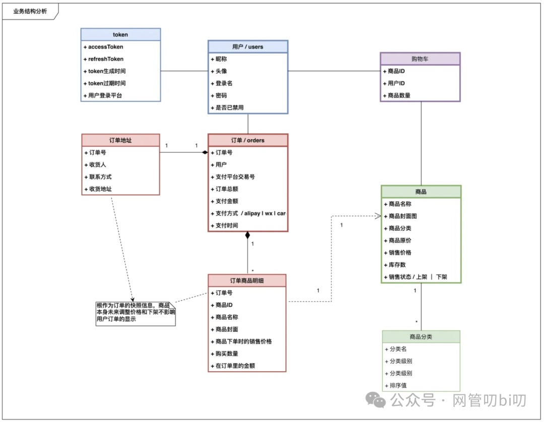 可以看到订单中,订单是业务的聚合根,其下还有订单商品明细和订单地址。为什么要有后面两部分呢? 在上图的注释里我们做了标注:它们是作为订单的快照信息,因为如果订单直接跟商品ID和用户地址ID关联的话,假如未来商品调整了价格、下架了亦或是用户搬家更新了地址,万一哪天“秋后算账”看看之前的订单,就会出现订单信息跟用户自己当初购买时信息不一致的情况。