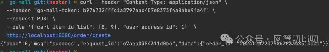 重启项目后我们,发起创建订单请求把购物车中的购物项下单, 请求结果如下。