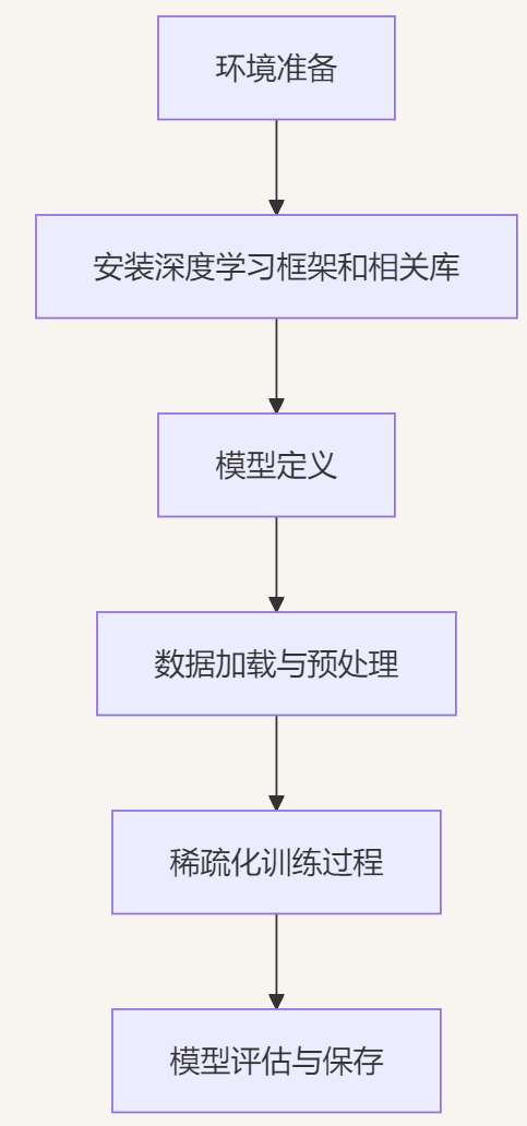 在开始稀疏化训练之前,需要确保开发环境已经正确配置。这包括安装必要的深度学习框架(如PyTorch或TensorFlow)、相关的库和工具。例如,在PyTorch环境中,可以通过以下命令安装必要的包: