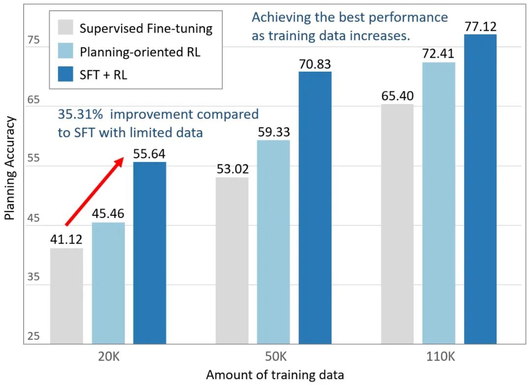 基于真实驾驶场景的大规模数据集上的实验和消融验证了 AlphaDrive 的先进性。与 SFT 训练的模型相比,AlphaDrive 的规划准确率显著提升了 26%,并且在仅使用 1/5 的训练数据的情况下,性能比 SFT 训练的模型高出 35%。另外,在强化学习阶段,AlphaDrive 展出的涌现的多模态规划能力,和 DeepSeek R1 的「Aha Moment」有相似之处,证明了强化学习在自动驾驶大模型的应用潜力。
