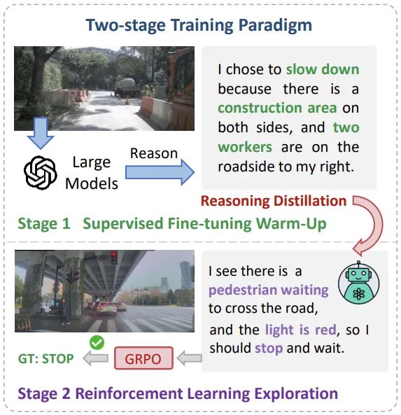 因此,我们想要尝试回答如下问题:如何将在通用大模型领域大放异彩的强化学习和推理技术应用于自动驾驶,尤其是决策规划,从而提升大模型在自动驾驶任务上的表现,并降低训练开销。