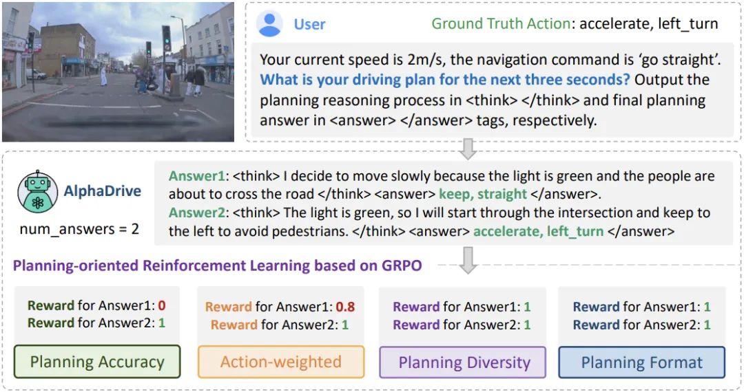 针对上面的问题,我们提出了 AlphaDrive, 一种针对决策规划的 VLM 的强化学习和推理训练框架。