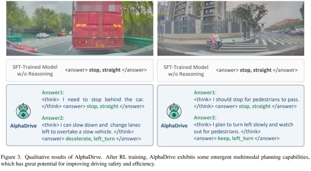 具体而言,AlphaDrive 提出了四种针对规划的强化学习 GRPO rewards。另外,我们提出一种基于 SFT 和 RL 的两阶段规划推理训练策略。在强化学习阶段,AlphaDrive 展出的涌现的多模态规划能力,和 DeepSeek R1 的「Aha Moment」有相似之处,也证明了强化学习在自动驾驶大模型的应用潜力。据我们所知,AlphaDrive 实现了首次将基于 GRPO 强化学习和规划推理引入自动驾驶规划,在规划性能和训练效率上都取得显著的进步。