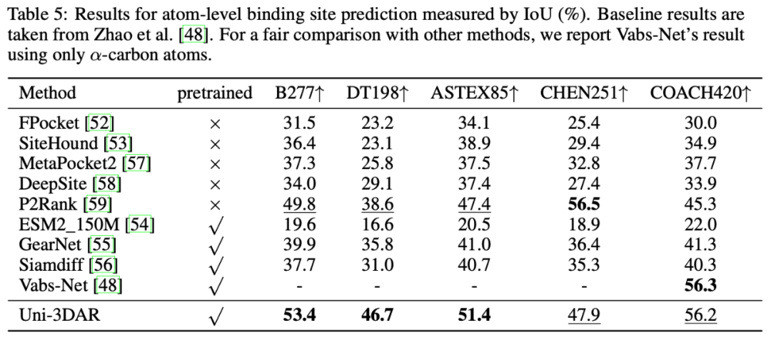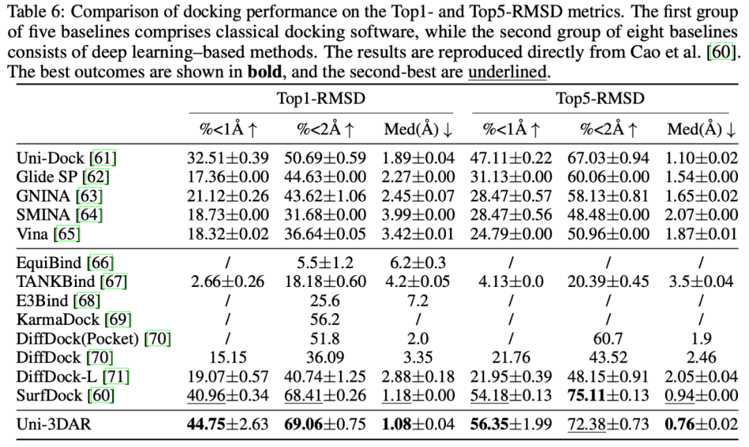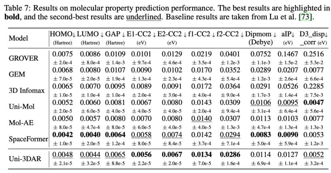 基于预训练的小分子属性预测效果,其中 Uni-Mol 和 SpaceFormer 也为深势科技提出的专用模型,Uni-3DAR 超过了 Uni-Mol,与 SpaceFormer 基本持平