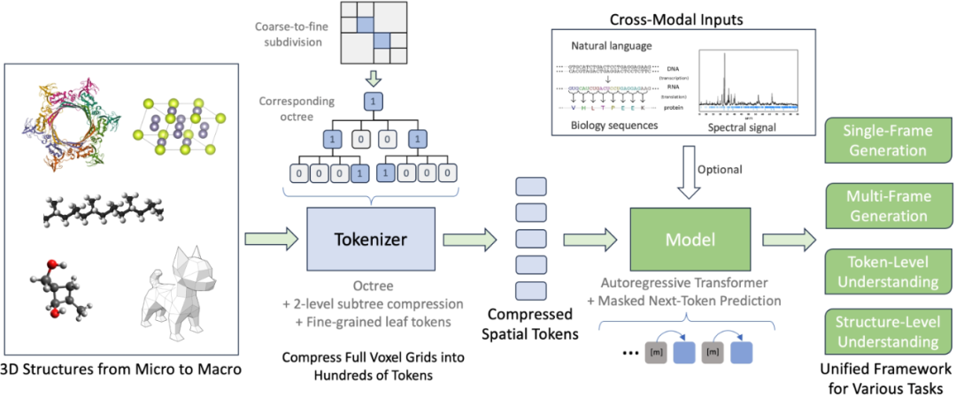 从微观世界的分子与材料结构、到宏观世界的几何与空间智能,创建和理解 3D 结构是推进科学研究的重要基石。3D 结构不仅承载着丰富的物理与化学信息,也可为科学家提供解构复杂系统、进行模拟预测和跨学科创新的重要工具。如何准确且高效地构建 3D 模型、理解和生成 3D 世界正在成为 AGI、AI for Science、具身智能三大 AI 热门领域共同关注的焦点。而随着 AI 技术的发展,大型语言模型(LLM)与大型多模态模型(LMM)那强大的自回归下一 token 预测能力也已经在开始被用于创建和理解 3D 结构。基于此,我们看到了 AI for Science 的新可能。