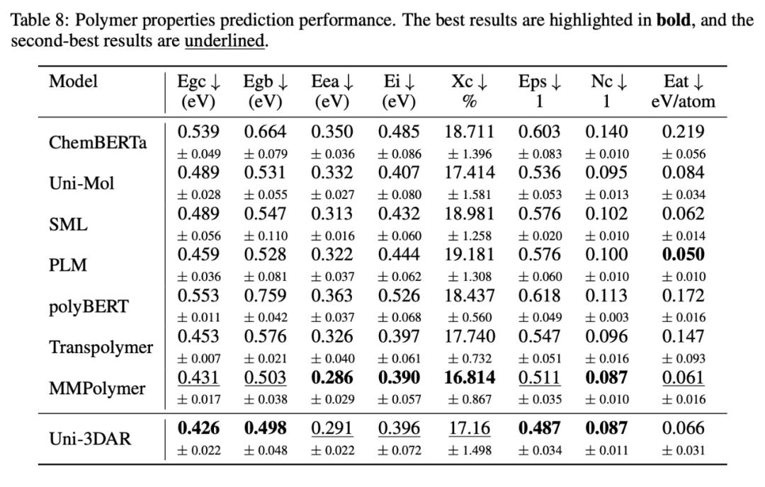 基于预训练的高分子聚合物性质预测,其中 Uni-Mol 和 MMPolymer 也为深势科技提出的专用模型,Uni-3DAR 超过了 Uni-Mol,与 MMPolymer 基本持平
