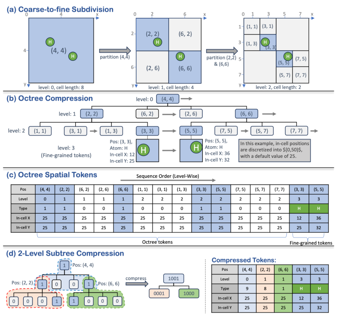 该方法首先利用八叉树对整个 3D 空间进行无损压缩。具体做法是从包含整个结构的一个大格子开始,针对非空格子(即包含原子或其他结构信息的区域),递归地将其均分为 8 个等大小的子单元。经过多层细分后,形成一个由粗到细的层次结构,其每一层的 token 不仅记录了区域是否为空,还保留了该区域的空间位置信息(由所在层次及格子中心坐标确定),为后续的自回归生成提供了明确的空间先验。