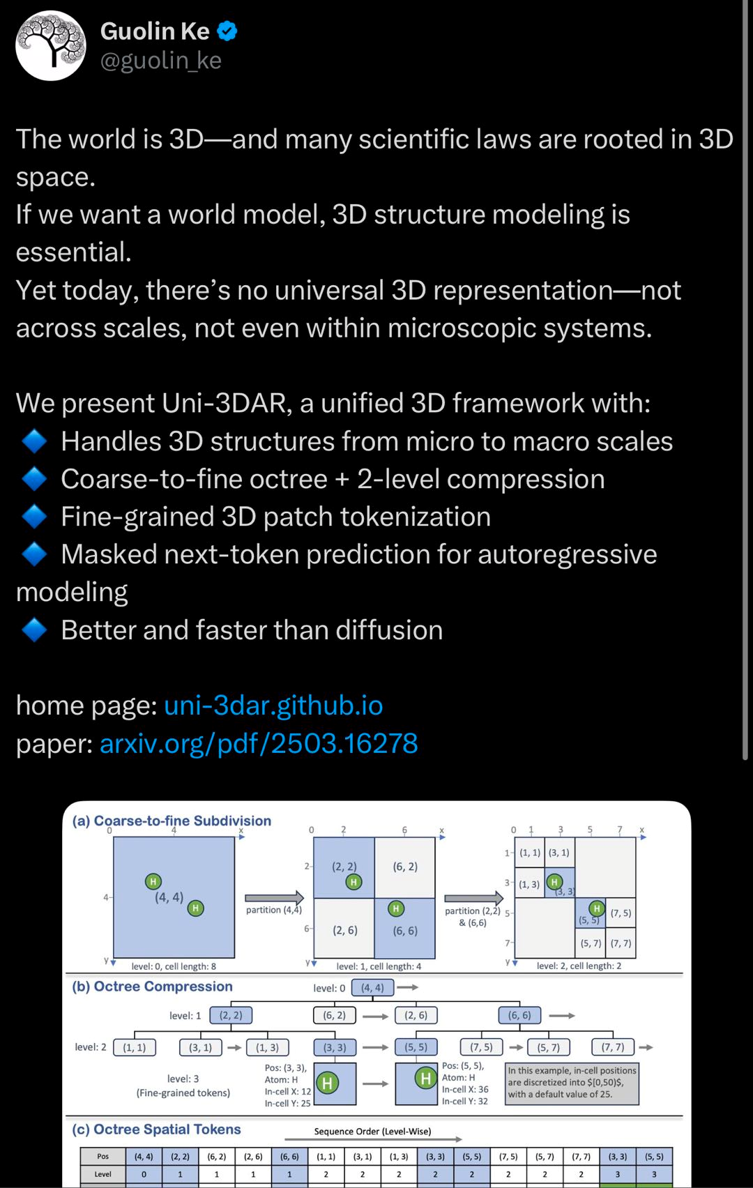 柯国霖在 𝕏 上分享表示:Uni-3DAR 的核心是一种通用的粗到细 token 化方法(coarse-to-fine tokenization),它能将 3D 结构转化为一维的 token 序列。