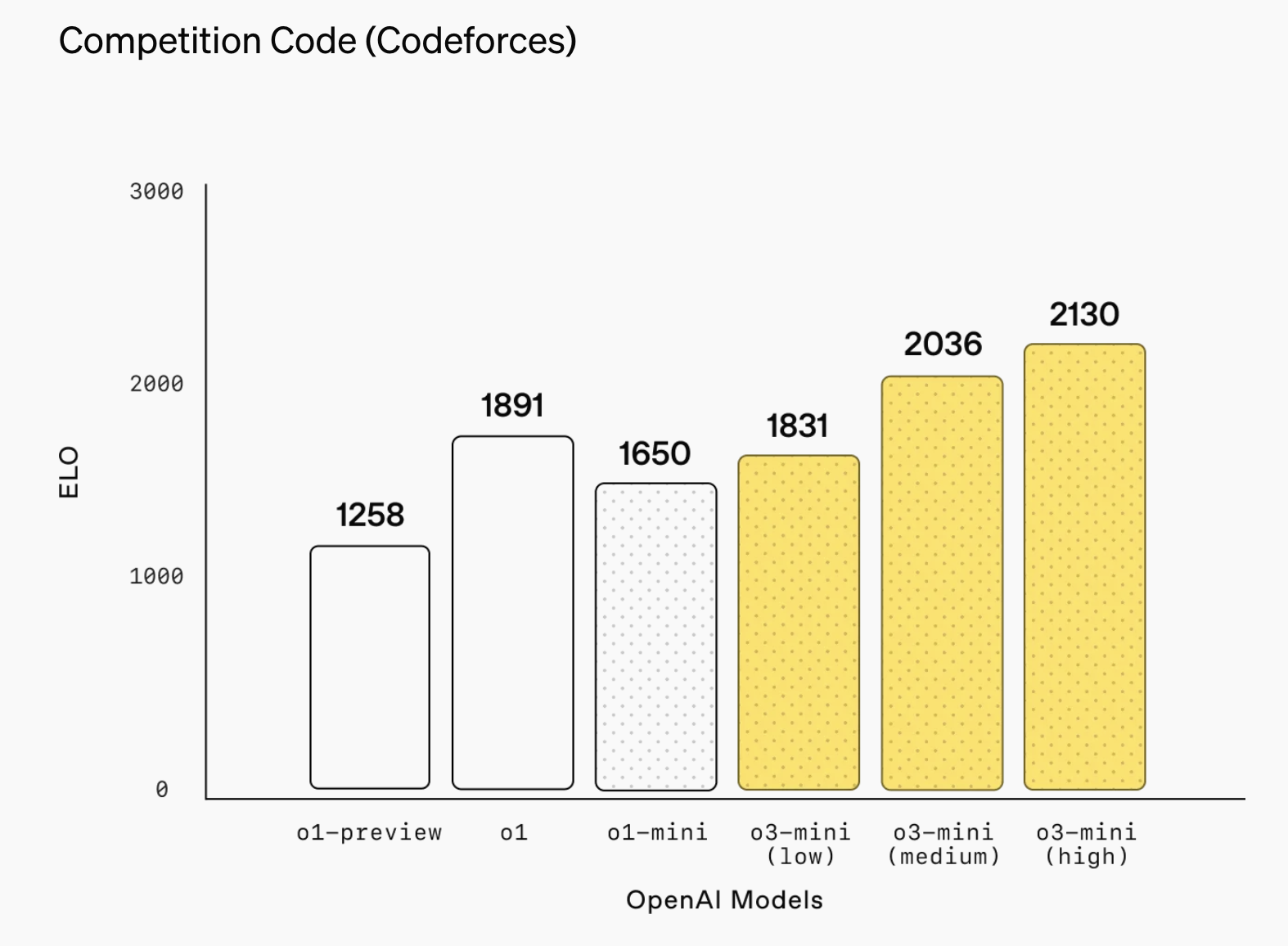 除了推理能力的增强,o3-mini 在代码生成方面也取得了明显进步。在 Codeforces 竞赛编程中,随着推理强度的增加,o3-mini 的 Elo 评分逐步提升,并在所有推理强度下均优于 o1-mini。在中等推理强度下,其代码能力更是可以媲美 o1。