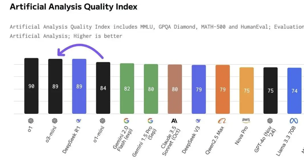 从 Artificial Analysis 评测来看,o3-mini 与 DeepSeek-R1 在整体评分上旗鼓相当,属于同一梯队。
