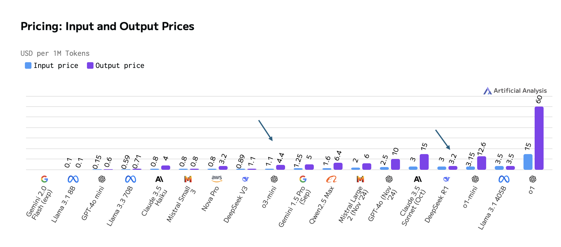 在价格方面,o3-mini 的定价已与 DeepSeek-R1 持平,而相较于 o1 模型,o3-mini 的价格便宜了 13 倍以上。这一优化让 o3-mini 在高性能、低成本的市场竞争中占据了一席之地。
