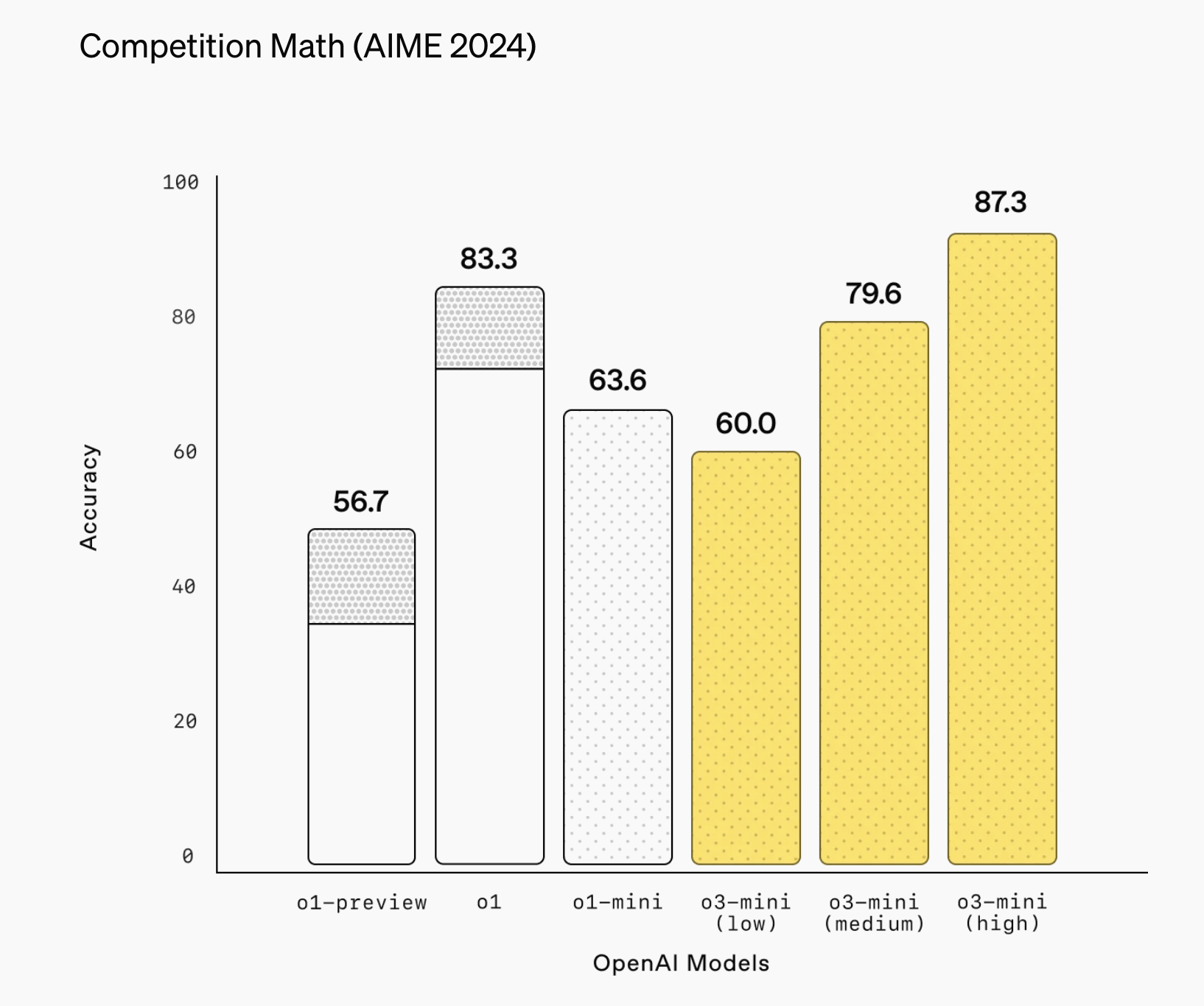 在中等推理强度下,o3-mini 在 AIME 和 GPQA 等高难度推理任务上的表现几乎与 o1 相当,进一步证明了其在逻辑推理和知识整合方面的强大能力。