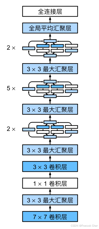 的两个Inception块。其中每条路径通道数的分配思路和第三、第四模块中的一致,只是在具体数值上有所不同。需要注意的是,第五模块的后面紧跟输出层,该模块同NiN一样使用全局平均汇聚层,将每个通道的高和宽变成1。最后我们将输出变成二维数组,再接上一个输出个数为标签类别数的全连接层。