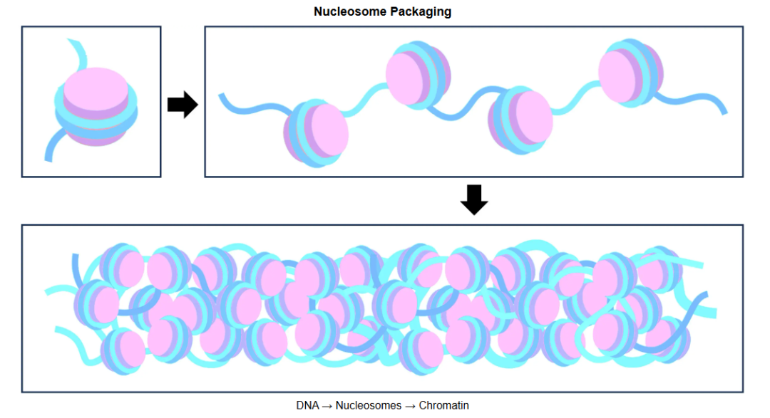 作为真核染色体DNA包装的第一级,核小体可使DNA长度压缩大约6倍。核小体之间通过连接DNA相连,在电镜下可观察到其以串珠的方式组织形成10nm纤丝,后者可进一步通过多级包装最终形成高度浓缩的染色体。相反,基因表达活跃部位以及处于复制或重组过程的区域则常伴随核小体结构的重塑或解聚,转而由多种非组蛋白结合,共同调控重要的生理过程(ATACseq测到的就是这部分序列)。