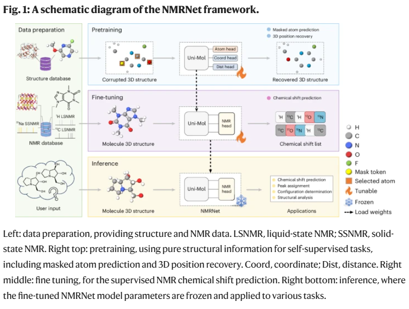 研究人员提出的 NMRNet 包含四个模块:数据准备、预训练、微调与推理。该框架基于 Uni-Mol 的 SE(3) Transformer 架构,适用于液态、固态和气态体系。数据准备阶段提取三维结构以建模原子环境,其中液态NMR使用分子结构,固态NMR则结合周期性边界条件与截断半径。