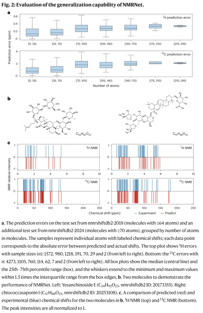 随后,研究人员进一步测试了模型在更大分子上的表现。结果表明,即使面对超过 100 个原子的复杂结构,NMRNet 仍保持较高的预测准确性(^1H 的 R² 为 0.954,^13C 为 0.997),说明模型具备良好的泛化与外推能力。