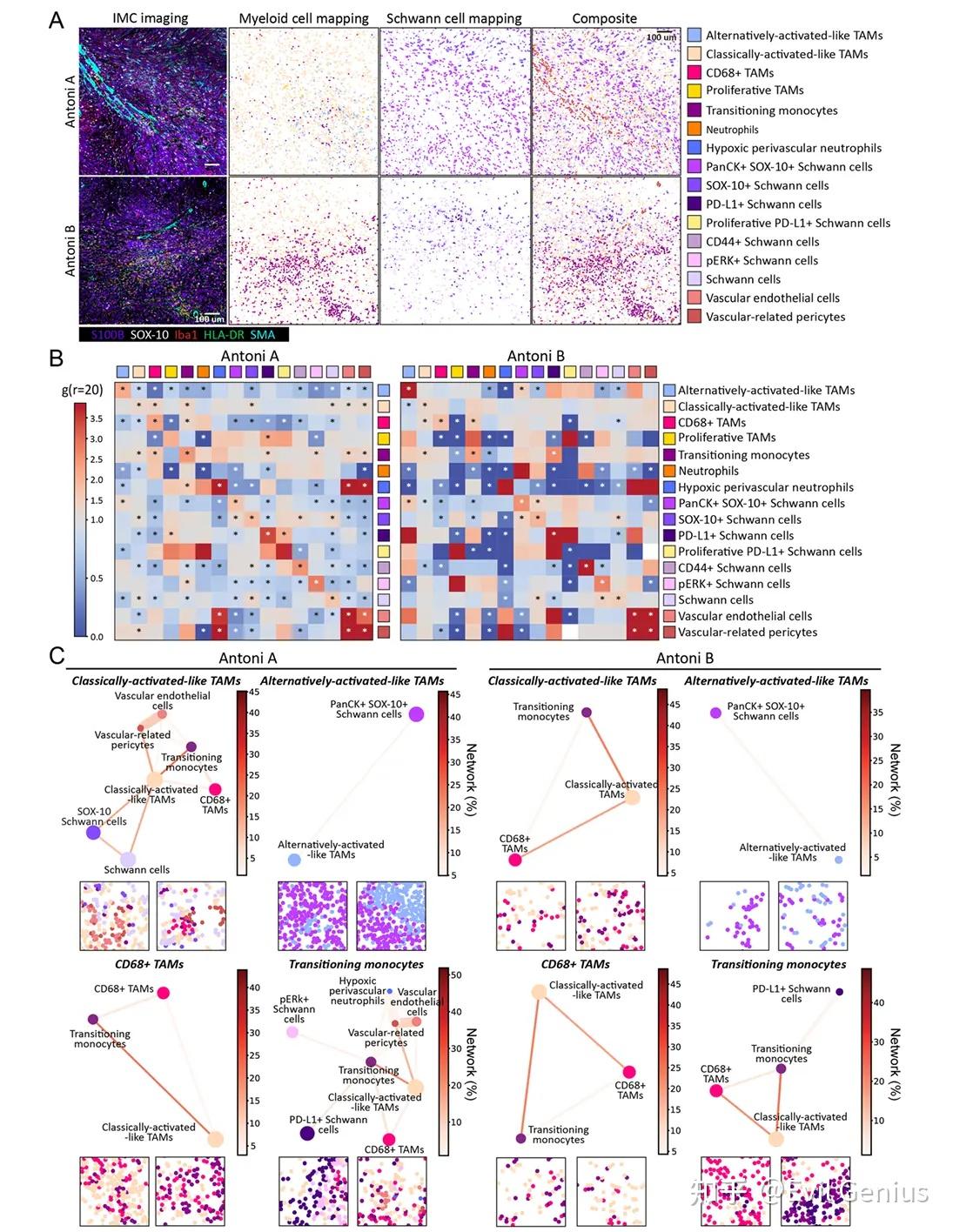 在Antoni A区的骨髓细胞之间,不同的细胞网络是异质的(如经典活化的TAM和转变的单核细胞)或同质的(如交替活化的样TAM和CD68 + TAM),其在Antoni B区中丢失(异质的)或维持(同质的)。