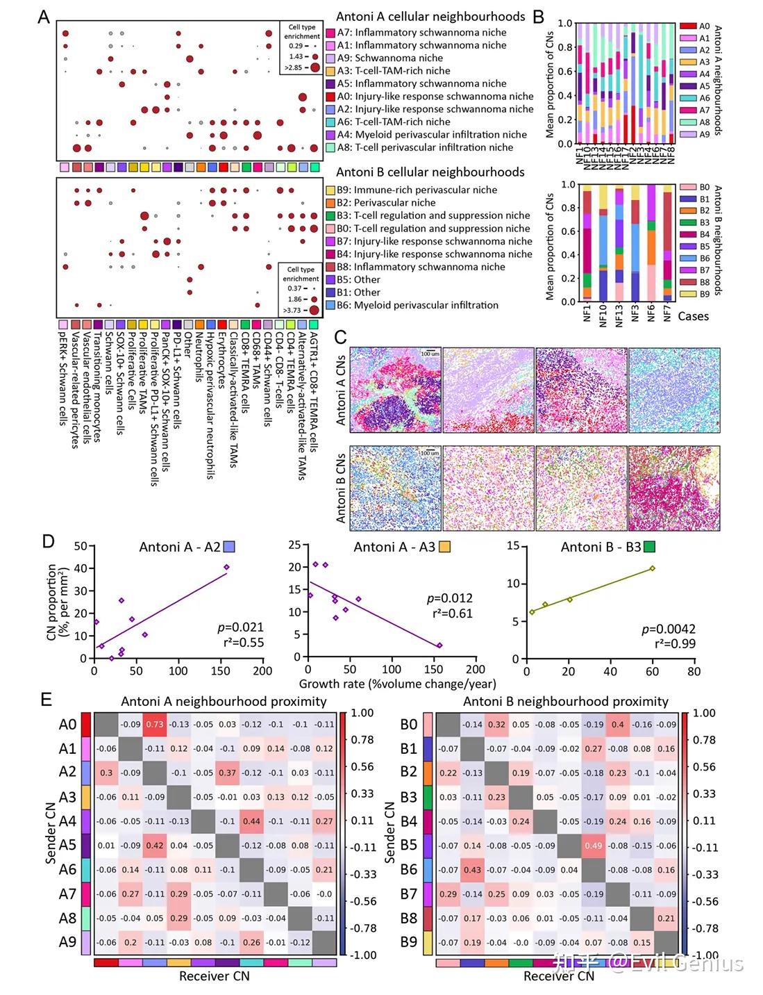 分析表明,Antoni A和B区显示出一定程度的空间组织性,其中CN与两个区域中保守的炎症和损伤样反应相关,然而,Antoni B区的组织性似乎低于Antoni A区,这可能驱动这些组织区域中T细胞抑制性niche的形成。