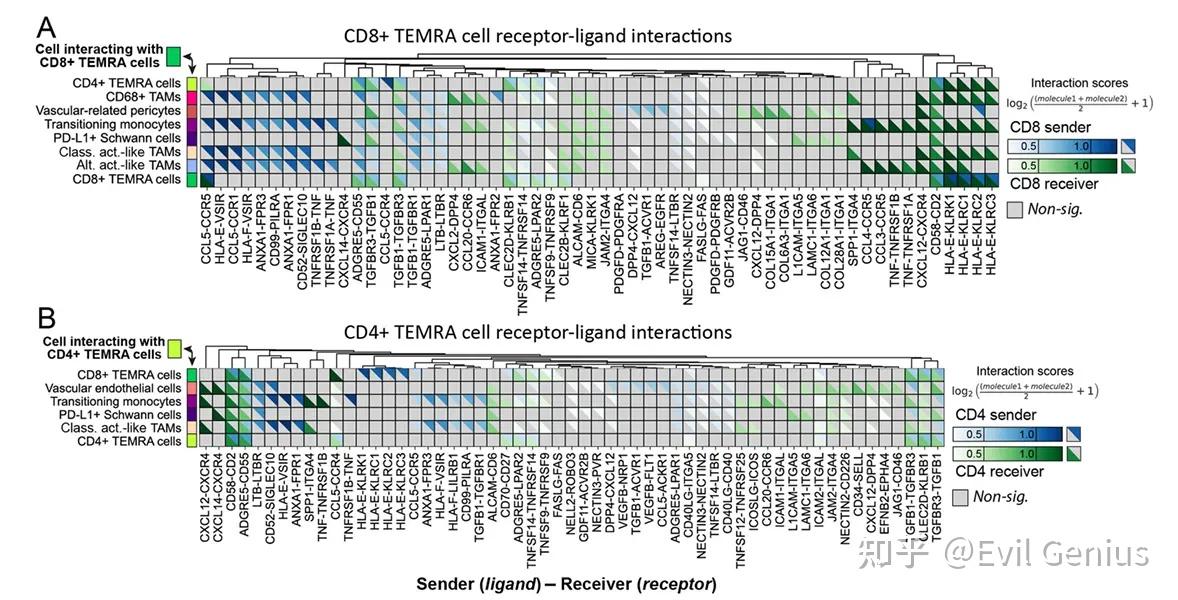 cellphoneDB进行配受体分析。相互作用共同表明,CD8+和CD4 + T细胞通过趋化和外渗途径,特别是在Antoni A区域,以及广泛的调节网络,限制了跨两个组织形态学niche的抗肿瘤反应,主动募集到VS的TME中。