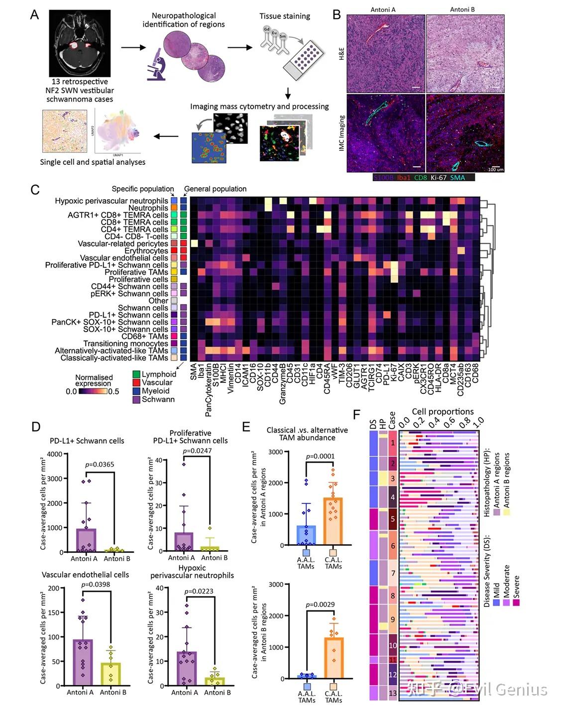 虽然VS的肿瘤结构已经在病理水平上被定义,发现了细胞过多的Antoni A区和细胞较少的松散组织的Antoni B区,但Antoni A和B区的细胞图谱,特别是这些不同区域内免疫细胞的区室化和活性,还有待研究。