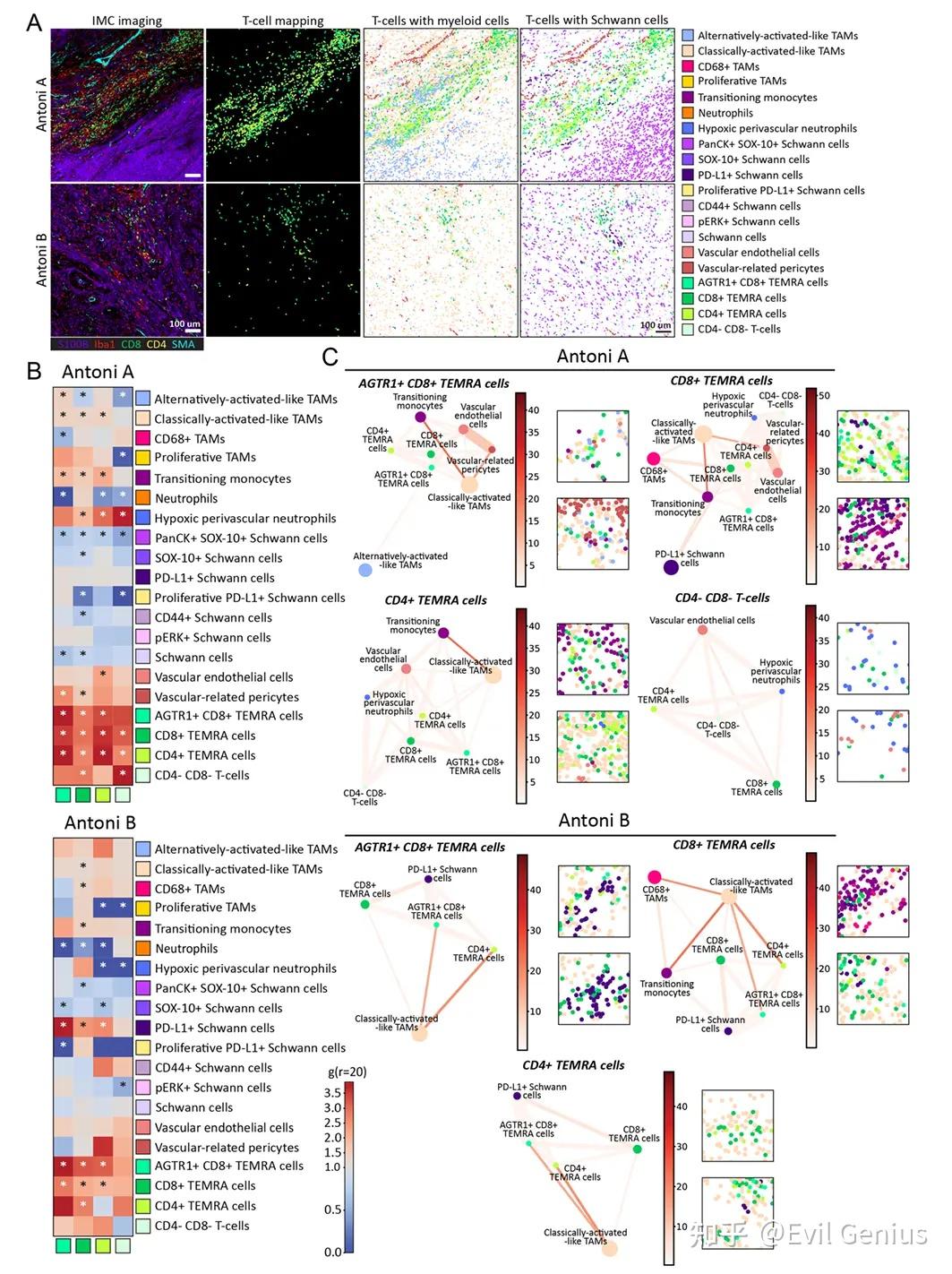 鉴于细胞间相互作用和T细胞群在Antoni A和B区的定位存在明显差异,我们接下来通过ACN分析研究了这些组织形态学niche中T细胞群的细胞网络。