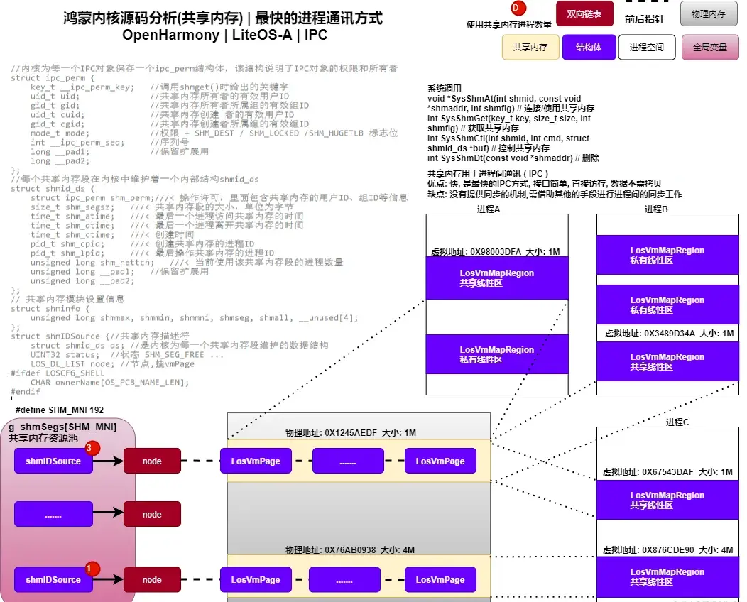 }ShmDt中主要干了解除映射LOS_ArchMmuUnmap这件事,没有了映射就不再有关系了,并且会检测到最后一个解除映射的进程时,会彻底释放掉这段共享内存ShmFreeSeg /**