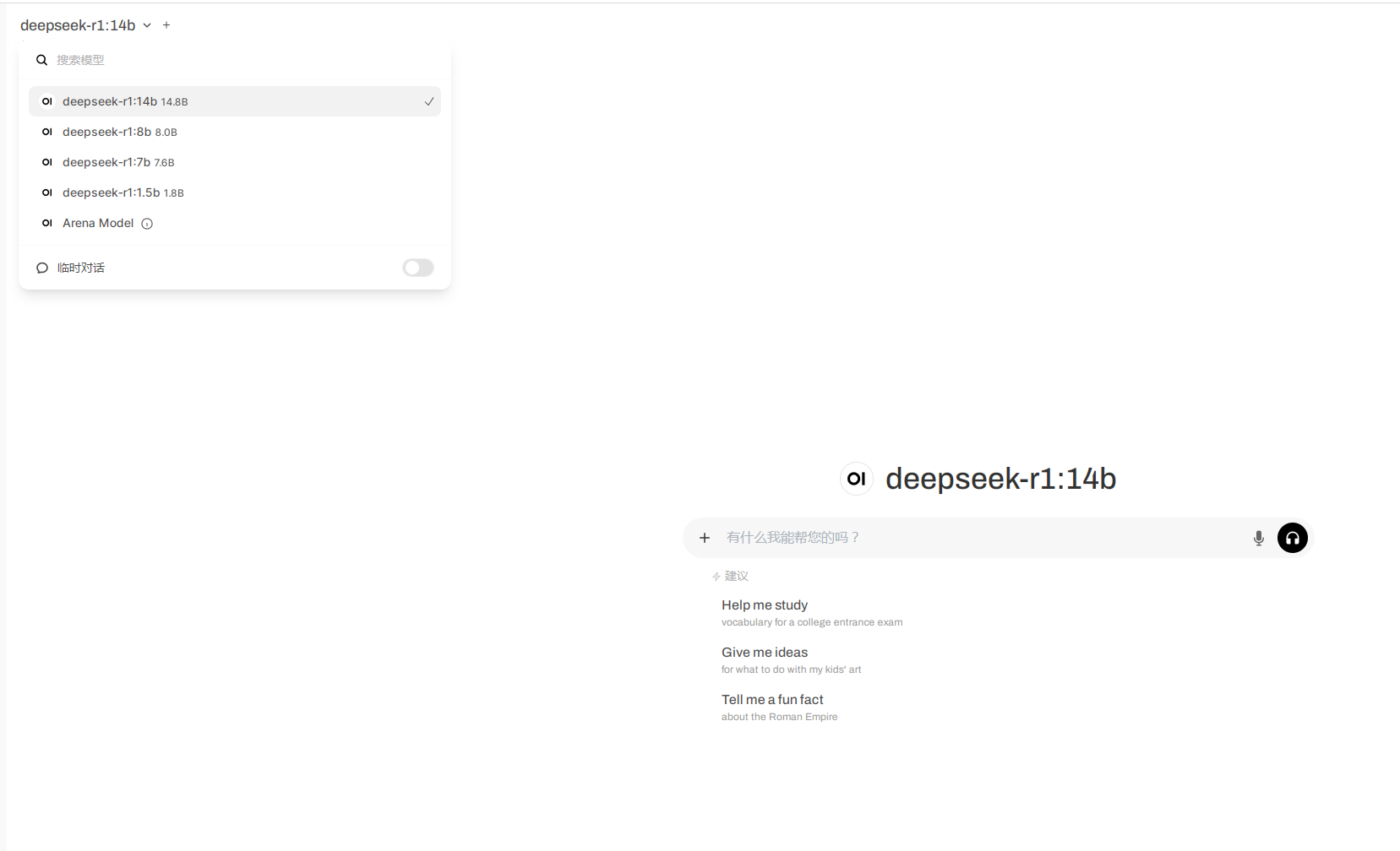 2)打开在在线对话。这里内置了deepseek-r1:1.5b、7b、8b,也可以自己进行deepseek-r1模型安装,比如这里的14b,就是自行安装的。