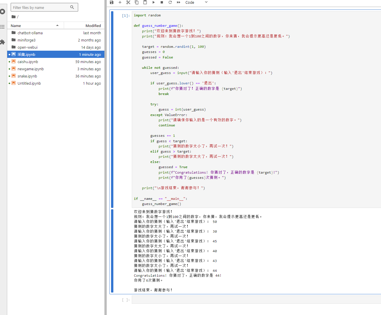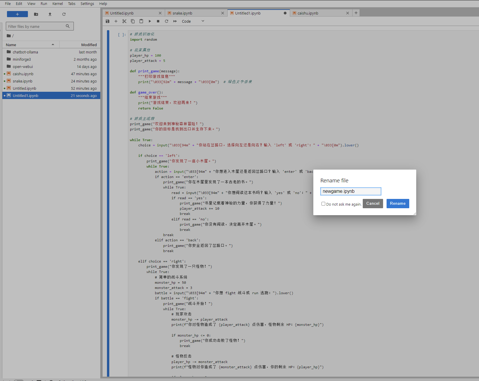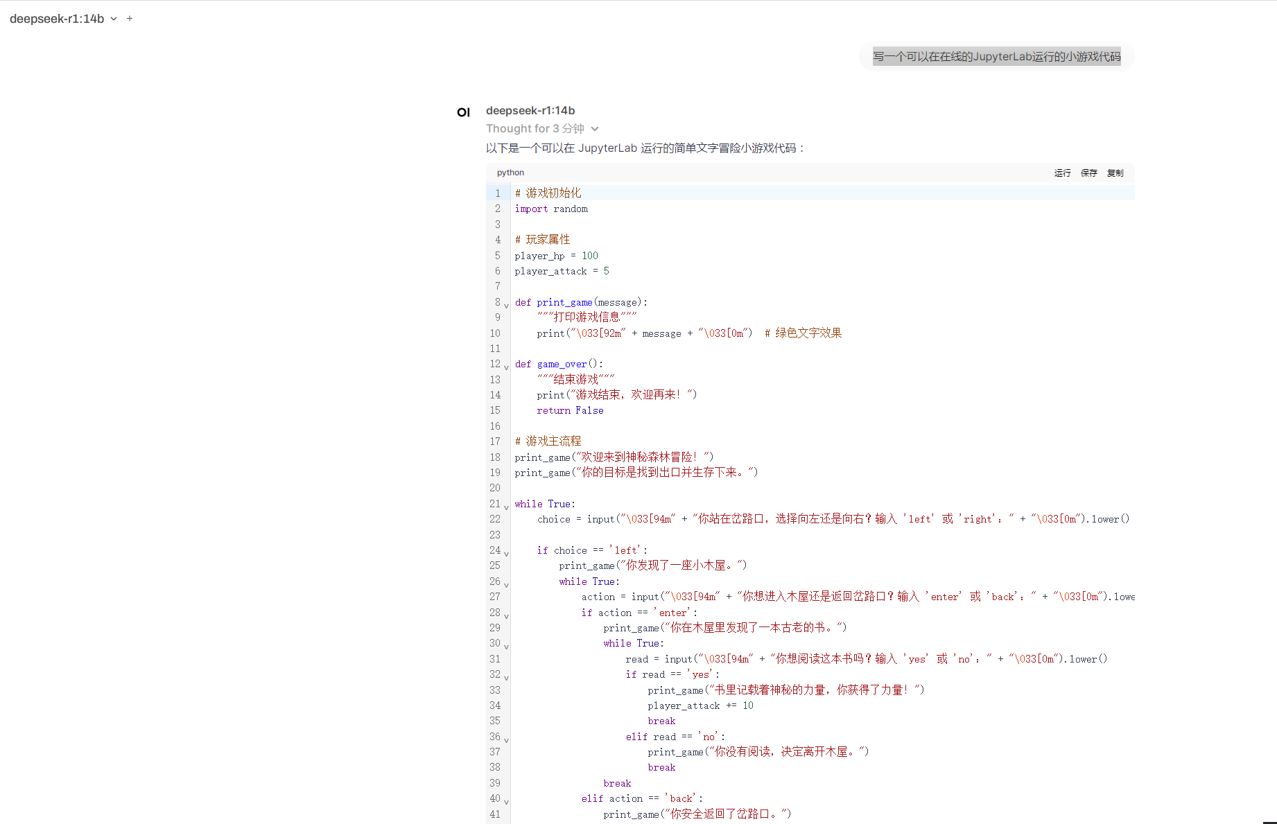3)选择14b来让deepseek帮我写一个可以在在线的JupyterLab运行的小游戏代码。