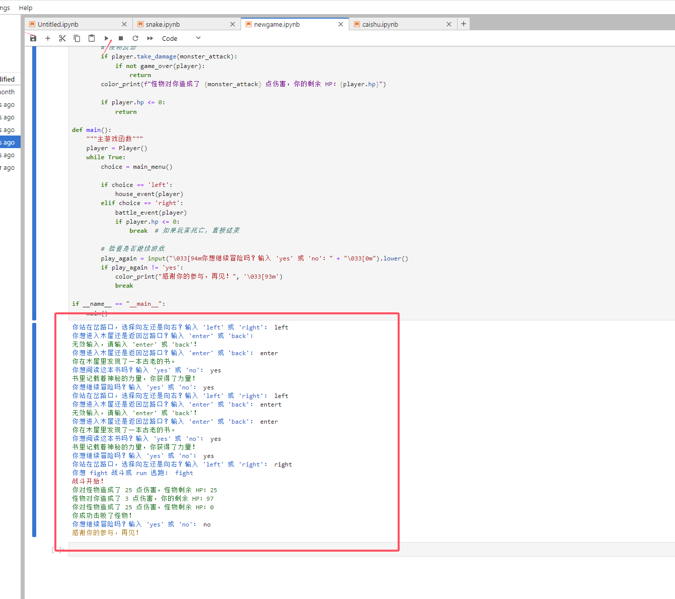 这个代码实现了一个简单的文字冒险游戏,包含以下特点: