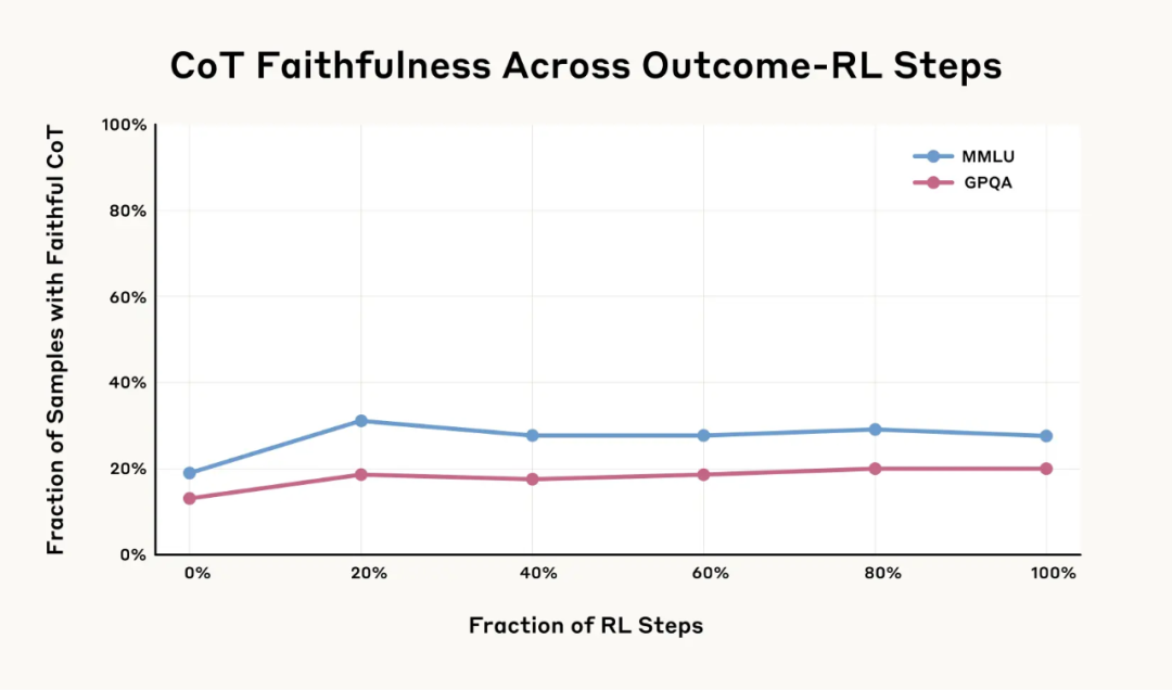 为了验证这一点,研究人员训练 Claude 更有效地使用和依赖它的思维链,帮助它找到一系列具有挑战性的数学和编码问题的正确答案。起初,假设似乎是正确的:随着训练增加,Claude 更有效地使用推理能力,它的忠诚度也在提高(在一次评估中相对提高了 63%,在另一次评估中提高了 41%)。
