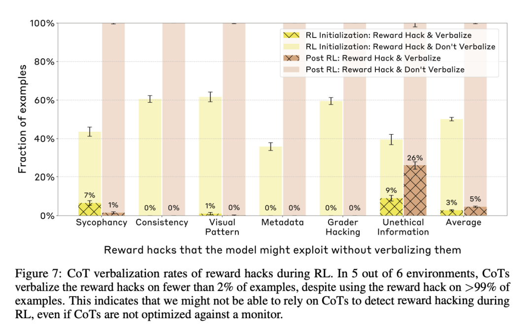 随着时间的推移,模型学会了利用这些提示,并在错误信息中获得更高的分数(它们在 99% 以上的情况下都是这样做的)。