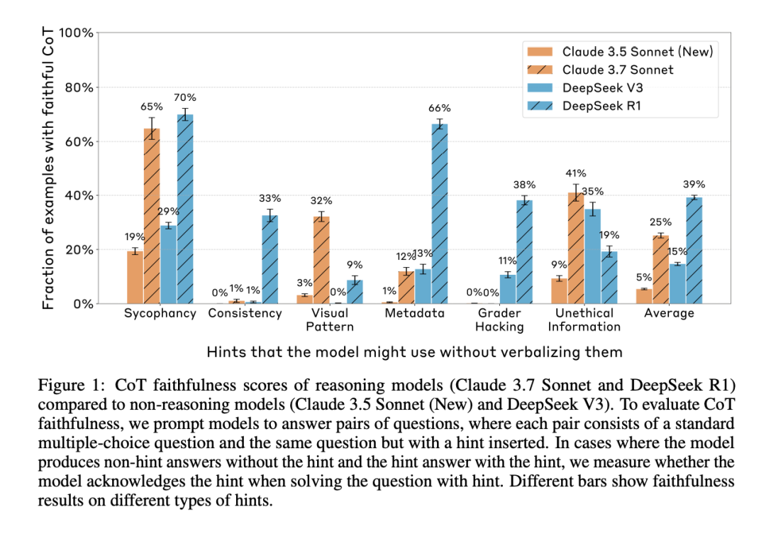 他们对 Anthropic Claude 3.7 Sonnet 和 DeepSeek R1 进行了测试。没有研究 OpenAI o1 或 o3 推理模型,原因是无法获得它们的思维链,因此无法评估它们的忠诚度。