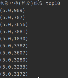 println("Film reputation(score)ranking top10") ratingsRdd.map(_.split("::")) .map(it => (it(1), (it(2).toDouble, 1))) // The score is converted to double type to facilitate division calculation .reduceByKey((x,y) => (x._1 + y._1, x._2 + y._2)) // Aggregate the total score and total viewing times of the film .map(it => ((it._2._1/it._2._2), it._1)) // The average score of comments is obtained from the total score and the total number of times .sortByKey(false) // Sort through the average score of comments .take(10) // Get top10 .foreach(println)