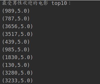 val gender = "M" val genderMap:Map[String, String] = Map("M"->"Male", "F"->"female sex") println(f"Most popular ${genderMap(gender)}Welcome movie top10: ") ratingsRdd.map(_.split("::")) .map(x => (x(0), (x(0), x(1), x(2)))) .join( // join the score and user gender according to the user ID usersRdd.map(_.split("::")) .map(x=> x(0)->x(1)) ) .filter(_._2._2.equals(gender)) // Screen out the corresponding gender .map(it => (it._2._1._2, (it._2._1._3.toDouble, 1))) // Find the average score to sort .reduceByKey((x,y) => (x._1+y._1, x._2+y._2)) .map(it => (it._2._1/it._2._2, it._1)) .sortByKey(ascending = false) .map(it => it._2->it._1) .take(10) .foreach(println)