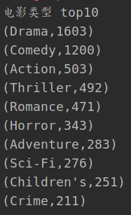 println("Film type top10") movieRdd.map(_.split("::")(2)) .flatMap(_.split("\\|")) .map((_, 1)) .reduceByKey(_+_) .map(it => (it._2, it._1)) .sortByKey(ascending = false) .map(it=> it._2->it._1) .take(10) .foreach(println)