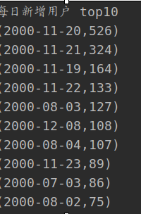 println("Daily new users top10") val sdf = new SimpleDateFormat("yyyy-MM-dd") ratingsRdd.map(_.split("::")) .map(it => (it(0), it(3).toLong*1000)) .map(it => (it._1, sdf.format(it._2))) .groupByKey() .map(it => (it._2.min, 1)) .reduceByKey(_+_) .map(it => it._2 -> it._1) .sortByKey(ascending = false) .map(it => it._2 -> it._1) .take(10) .foreach(println)