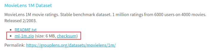 知名电影推荐数据集:MovieLen官网 https://grouplens.org/datasets/movielens/