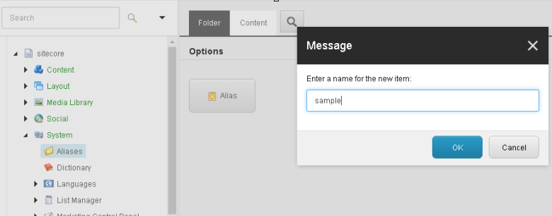 您所要做的就是登录Sitecore管理控制面板。在Sitecore树中,转到系统 - >别名,然后单击选项部分中的别名。提供别名的名称,如下面的屏幕截图所示。单击“ 确定”按钮以保存别名。