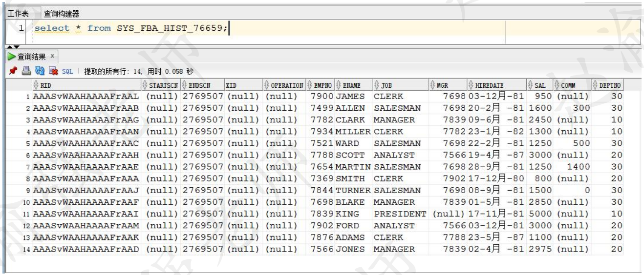 DEPTNO NUMBER(2)(11)查看表SYS_FBA_HIST_76659中的数据如下图所示。