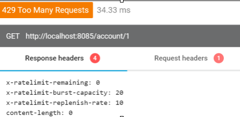 redis-rate-limiter.burstCapacity: 20现在,如果您调用网关公开的端点,您会得到以下响应。它包括一些特定的标头,以x-ratelimit. Headerx-ratelimit-burst-capacity表示to burstCapacityvalue,x-ratelimit-replenish-rate表示to replenishRatevalue,最重要的是x-ratelimit-remaining,它显示了你下一秒可能发送的请求数。