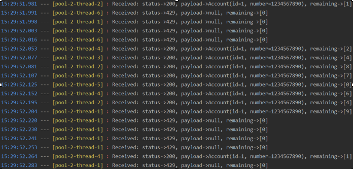 LOGGER.info("Received: status->{}, payload->{}, remaining->{}", r.getStatusCodeValue(), r.getBody(), r.getHeaders().get("X-RateLimit-Remaining"));