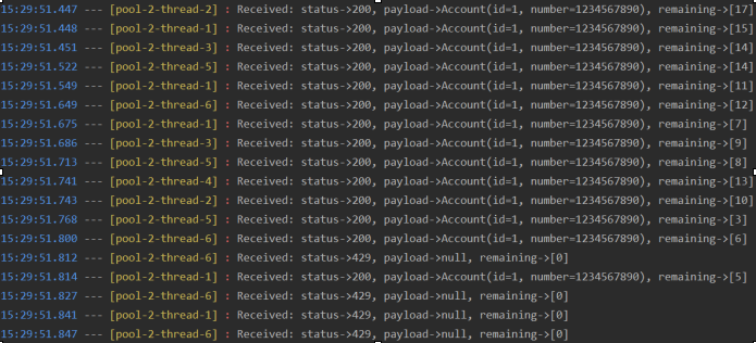 }假设我们有以下配置和在端口上运行的目标应用程序,8091我们可以执行一些测试调用。您可以设置两个属性来自定义流程。该redis-rate-limiter.replenishRate决定每秒用户多少个请求被允许发送,没有任何下降的请求。这是令牌桶被填充的速率。第二个属性redis-rate-limiter.burstCapacity是允许用户在一秒钟内执行的最大请求数。这是令牌桶可以容纳的令牌数量。将此值设置为零将阻止所有请求。