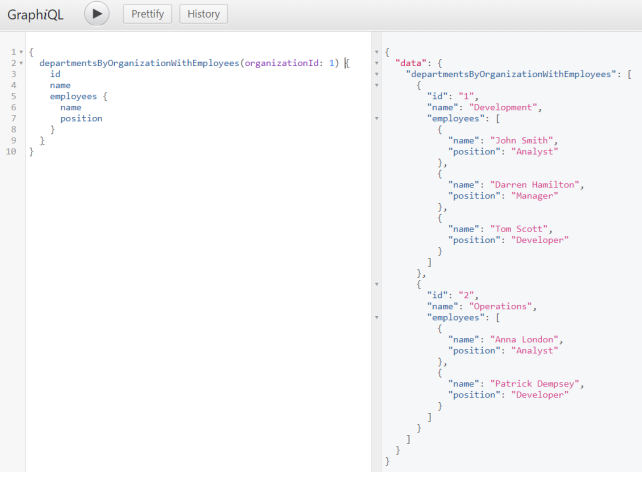 }现在,我们可以使用 GraphiQL 使用必填字段列表调用我们的测试查询。department-service默认情况下,应用程序在端口 8091 下可用,因此我们可以使用 address 调用它http://localhost:8091/graphiql。
