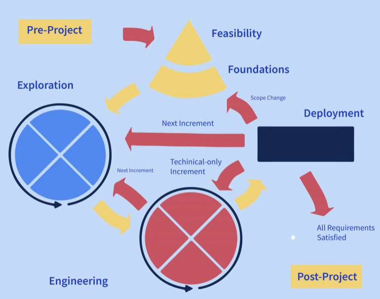 - 循环交付:在主要开发期间,团队在两个或多个交付周期中更新和优化发布计划。通过一个或多个集成迭代的程序测试,实现需求的子集。一个完全集成的产品可供实际用户使用。