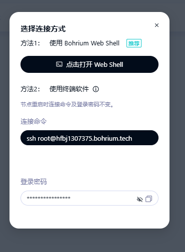 Bohrium 提供了网页版 SSH 工具 Web Shell,也支持您通过本地终端登录节点。