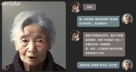 如果说技术狂热者的数字永生关乎自我延续,那么普通人的数字永生更多的是一种情感需求。近年来,一些公司推出了基于语音和文本数据的“数字交互逝者”,可以模拟亲人的语调、用词习惯甚至生活方式,向生者提供情感陪伴。2023年3月,B站up主吴伍六运用AI技术成功“复活”了自己奶奶的虚拟数字人形象,当吴伍六提问时,“奶奶”对答如流。看似简单的对话,让人产生亲人仍在身边的错觉,弥补了现实中不可逆的情感缺失。